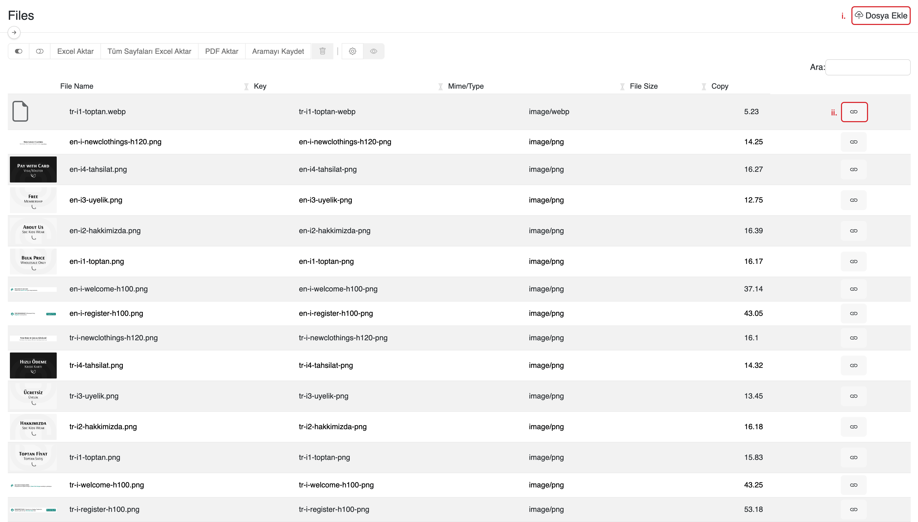 serB2B yönetici panelinden Tasarım > Dosyalar bölümüne giderek yüklediğiniz dosyaları listeleyin, dosya yükleyin ya da dosyanın linkini kopyalayın.