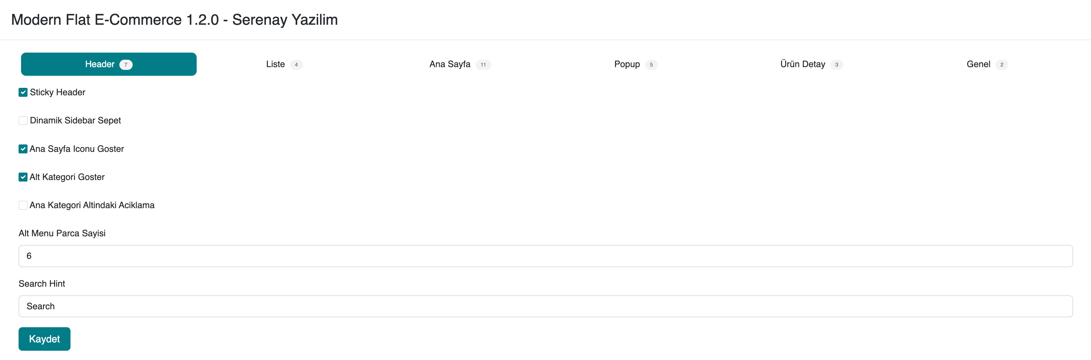 | Sticky Header | Üst menünün sayfa kaydırıldığında sabit kalması | Etkin / Devre Dışı |