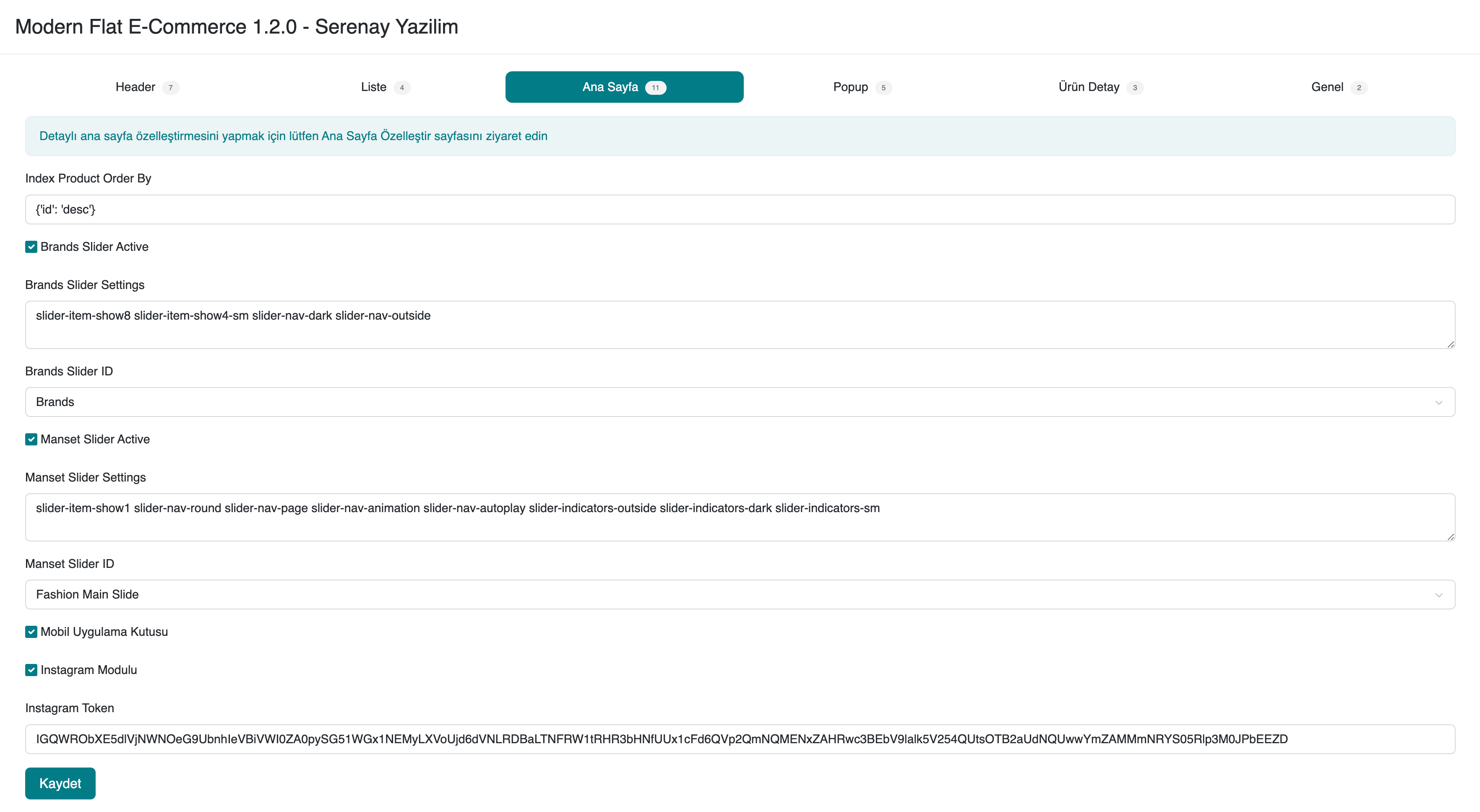 | Instagram Modülü | Listeleme sayfasına Instagram akışını ekler | Etkin / Devre Dışı |