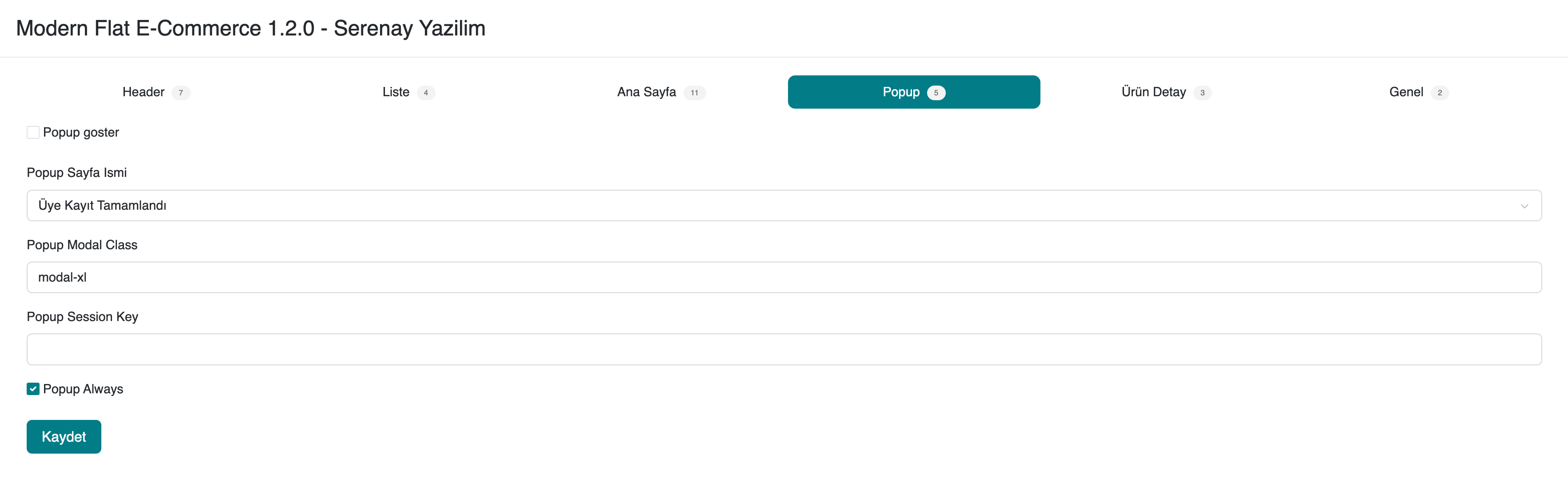 | Popup Göster | Ana sayfa veya diğer sayfalarda popup görüntüleyip göstermeme | Etkin / Devre Dışı |