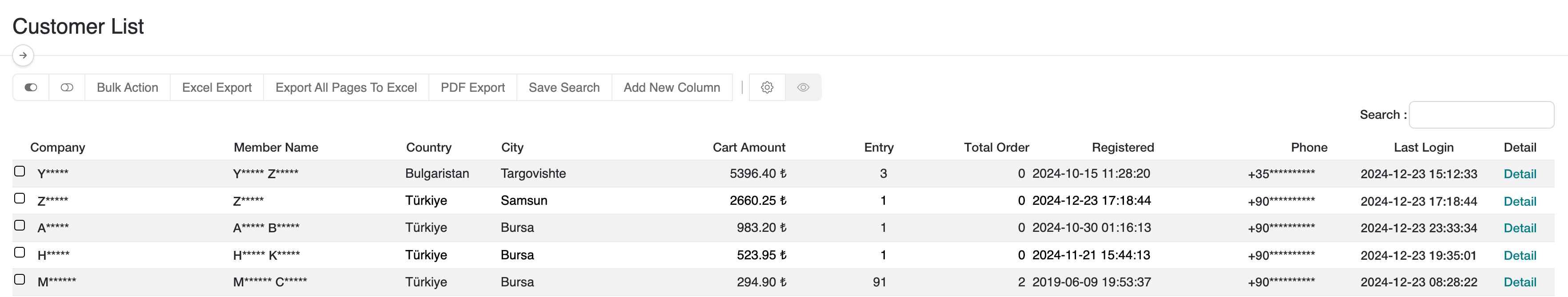 To view the list of users who have logged in daily, navigate to the Customers > Daily Logins menu in the serB2B admin panel. Here, you can examine detailed information about users' login times and IP addresses.