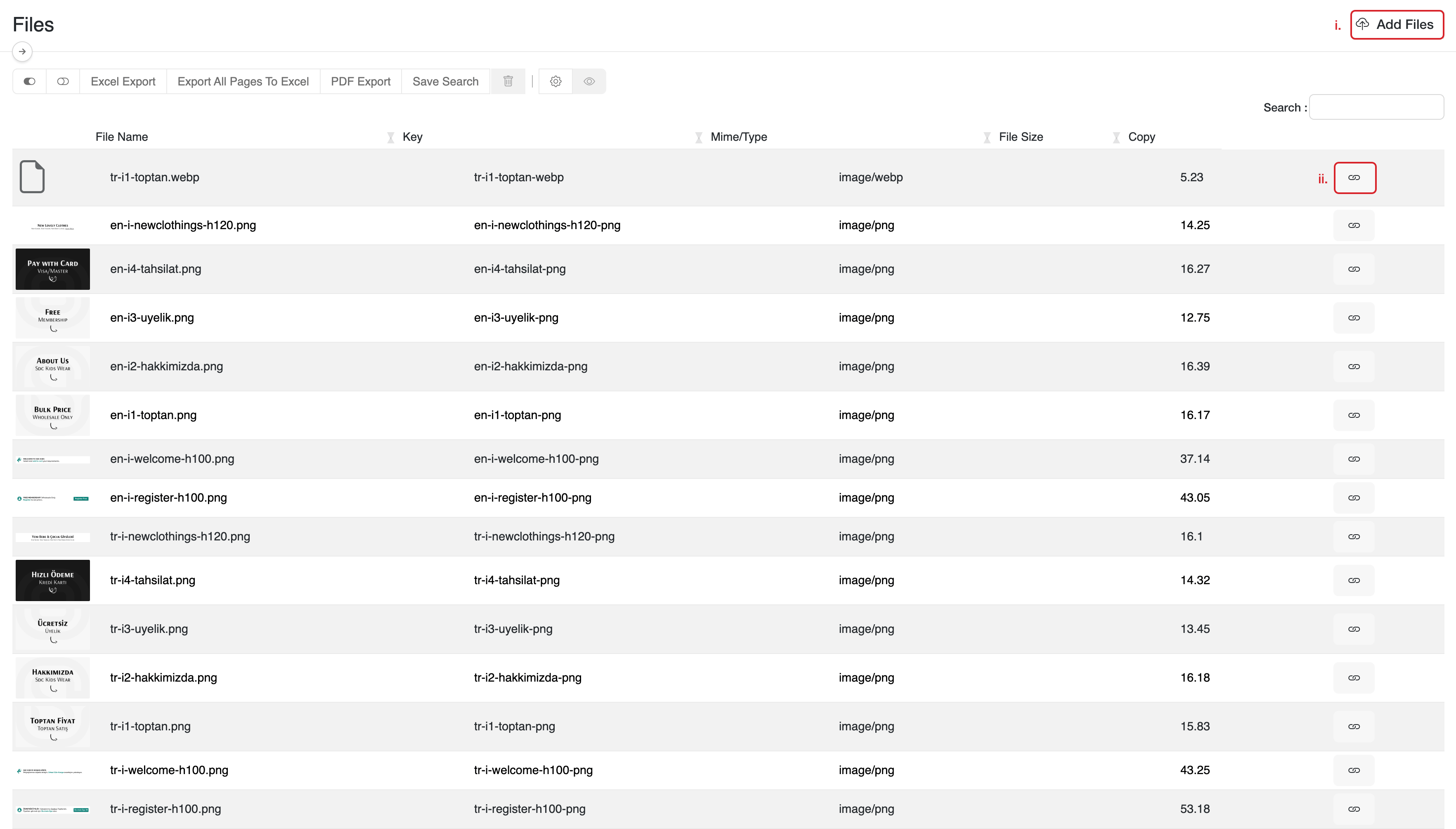 Go to the Design > Files section from the serB2B admin panel to list, upload, or copy the link of the files you have uploaded.