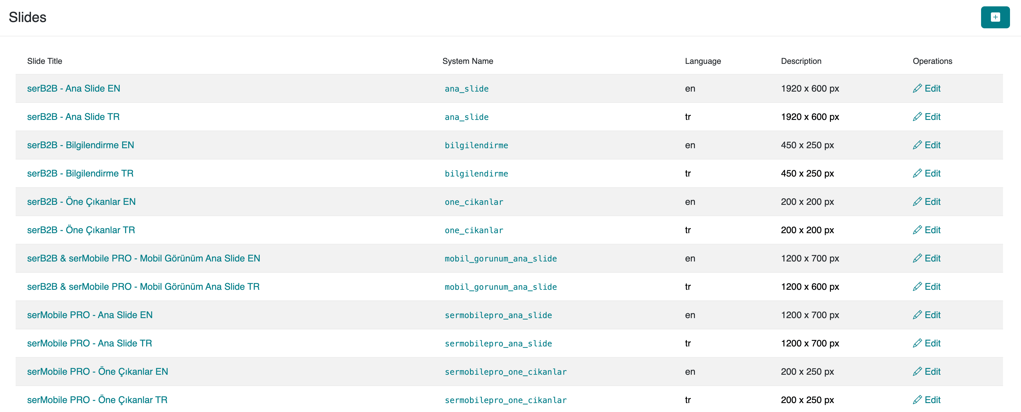 The Slide Management feature in the serB2B E-Commerce System allows you to easily create and manage slides for your web and mobile applications. With this feature, you can create new slide lists, add images to your slides, edit or delete existing slides. By managing your slides quickly and efficiently, you can optimize the user experience.