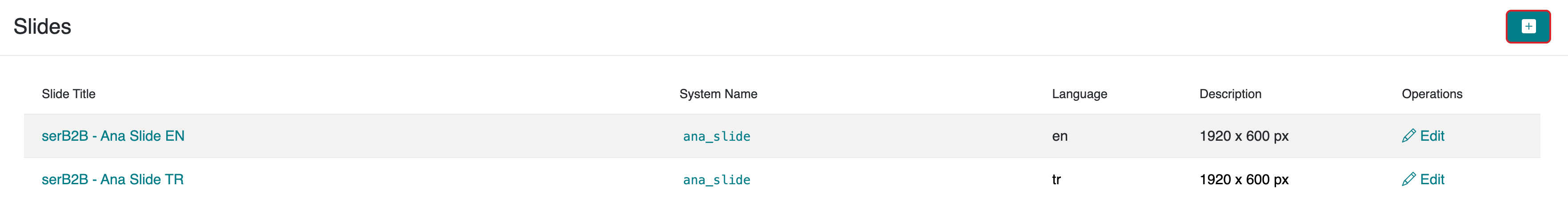 To add a new slide to your serB2B system, go to the Design > Slides section in the admin panel and click the + icon in the top right corner.