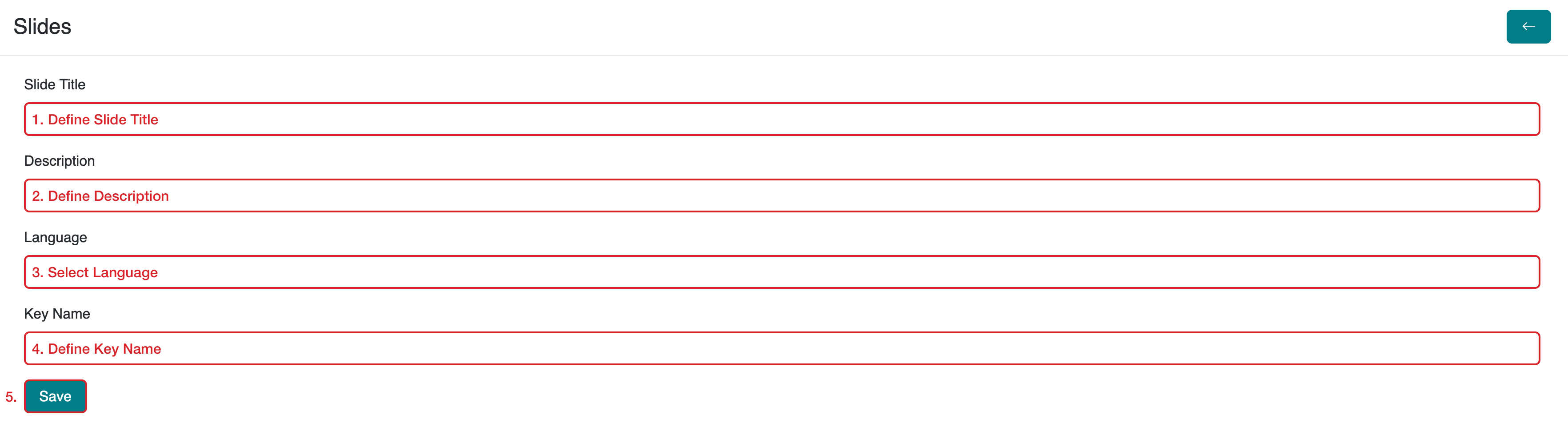 Define Description: Provide a description of the slide. (For example, define the standard resolution value of the images you want to upload, such as "1920 x 1080 px.")