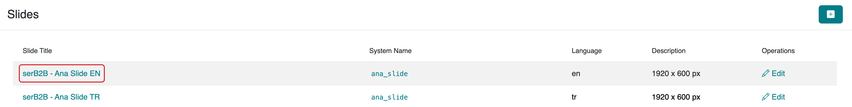 Navigate to the Design > Slides section in the admin panel of your serB2B system to view the slides defined in your system.