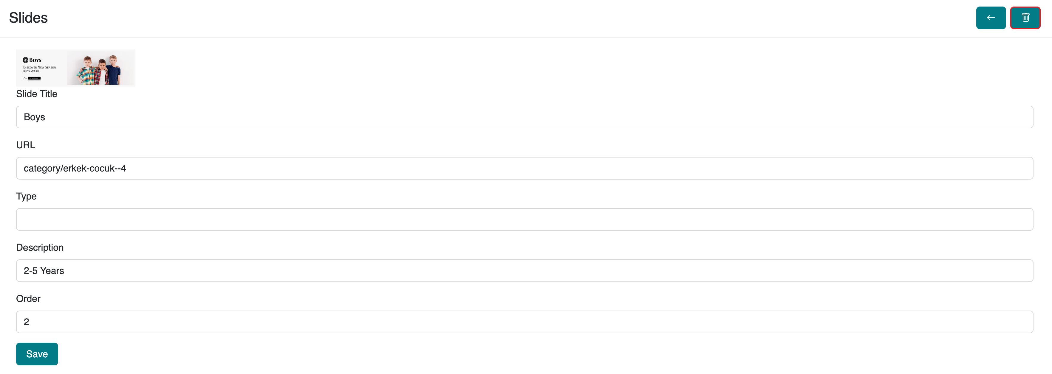 To edit a defined slide image or redirection settings, go to the Design > Slides section in the admin panel, click the relevant slide title, select the image you want to edit, and follow the steps in the Uploading Images and Adding Redirection to Slides section to make the necessary changes and save.