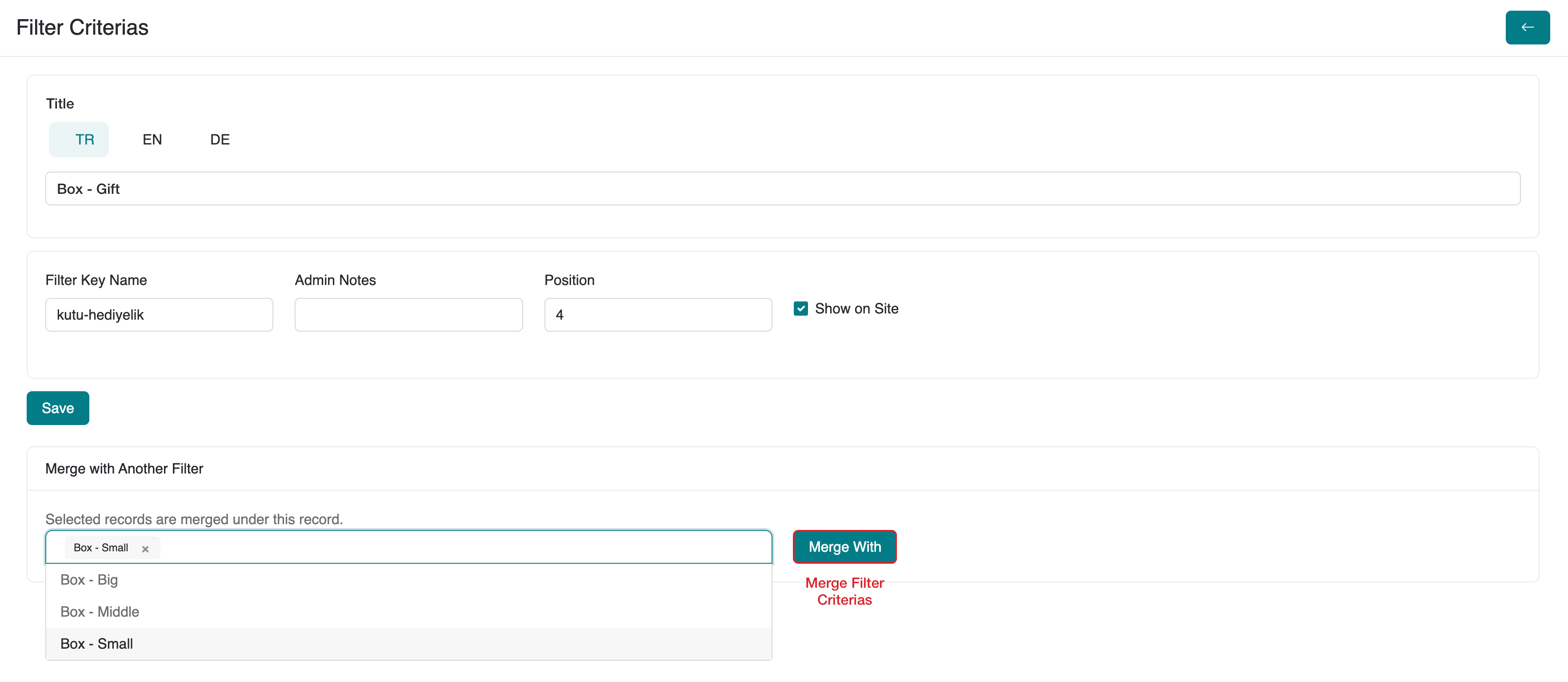 Let’s merge products with filter criteria defined as Box - Gift and Box - Small under the group Box - Gift.