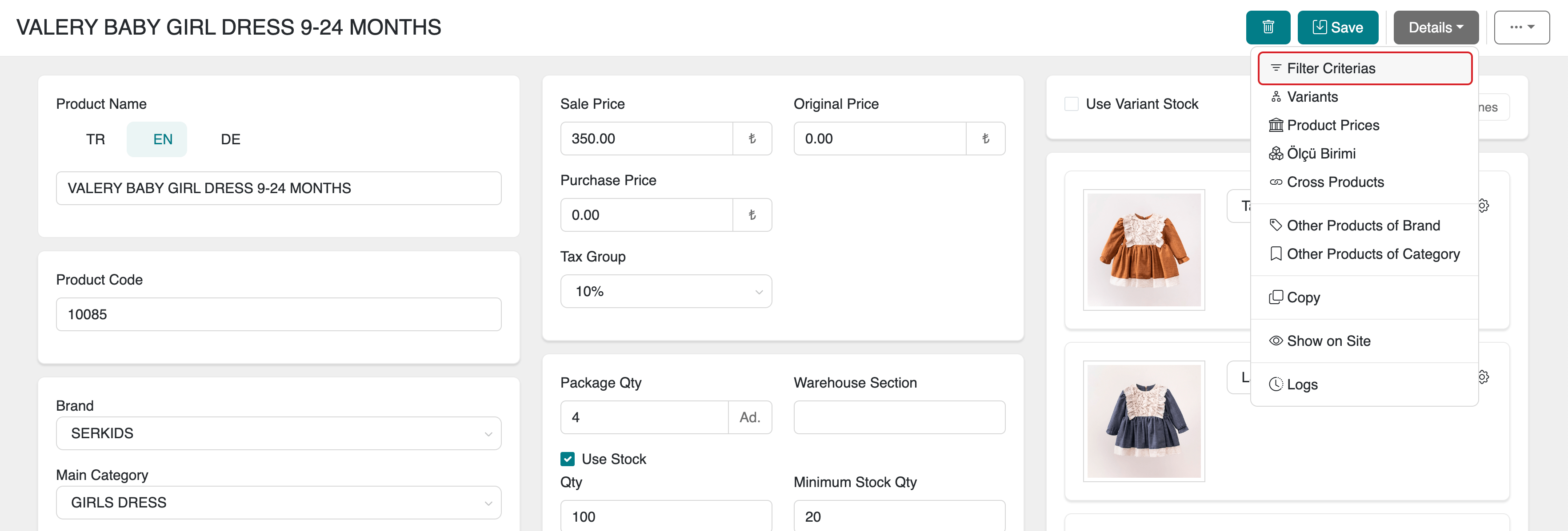 You can add filters to a specific product that you’ve uploaded to your serB2B system. Before doing this, define a filter group and filter criterion. Then, go to the product detail page in the admin panel, and click on Details > Filter Criteria in the top right corner.
