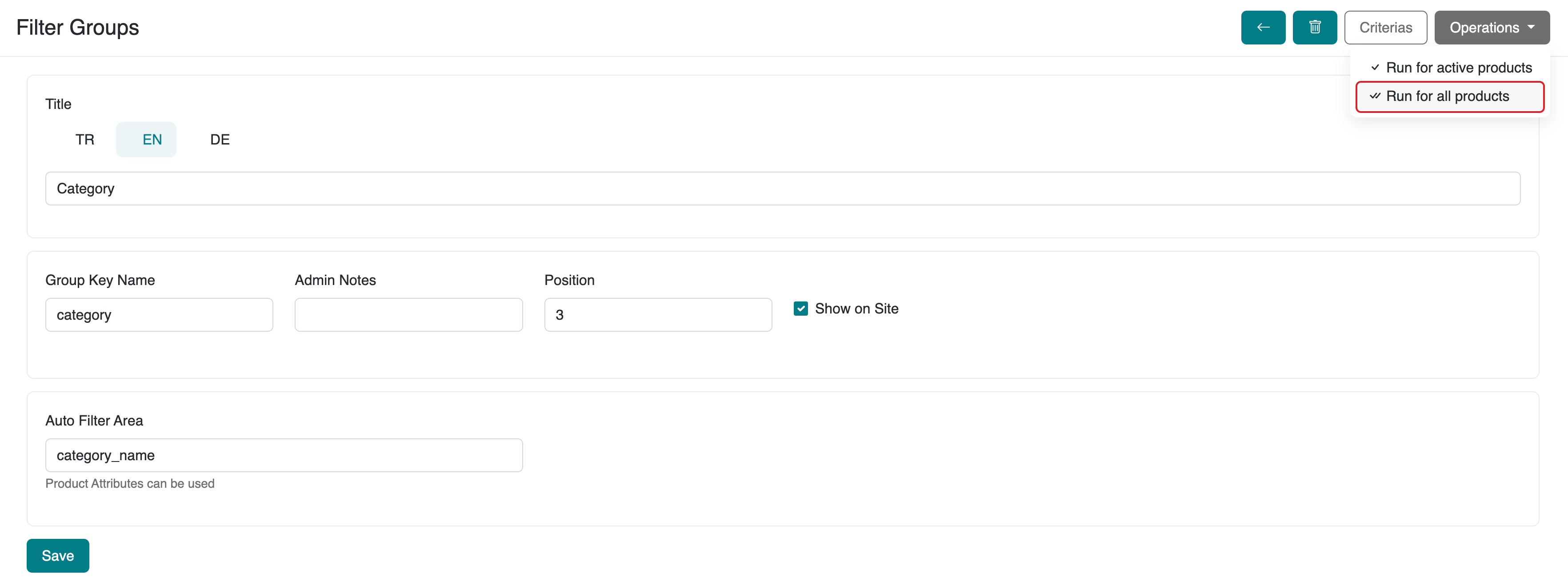 To apply a filter to all your active products at once, if you’ve defined an Automatic Filter Field for a filter group, go to the Actions section at the top right corner and select Run for Active Products or Run for All Products to complete the process.