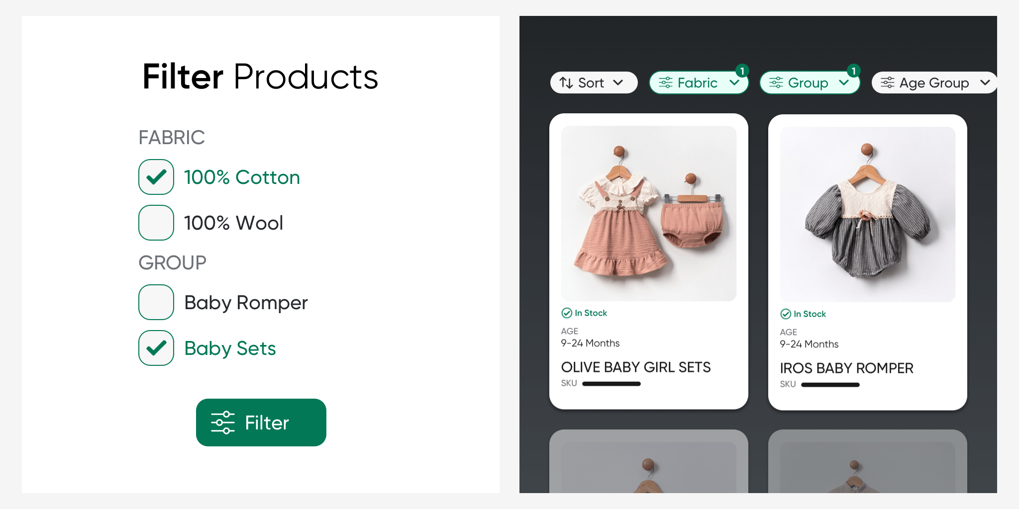 You can create filter criteria for the products defined in your serB2B system, enabling users to easily find the products they are looking for by filtering them correctly.