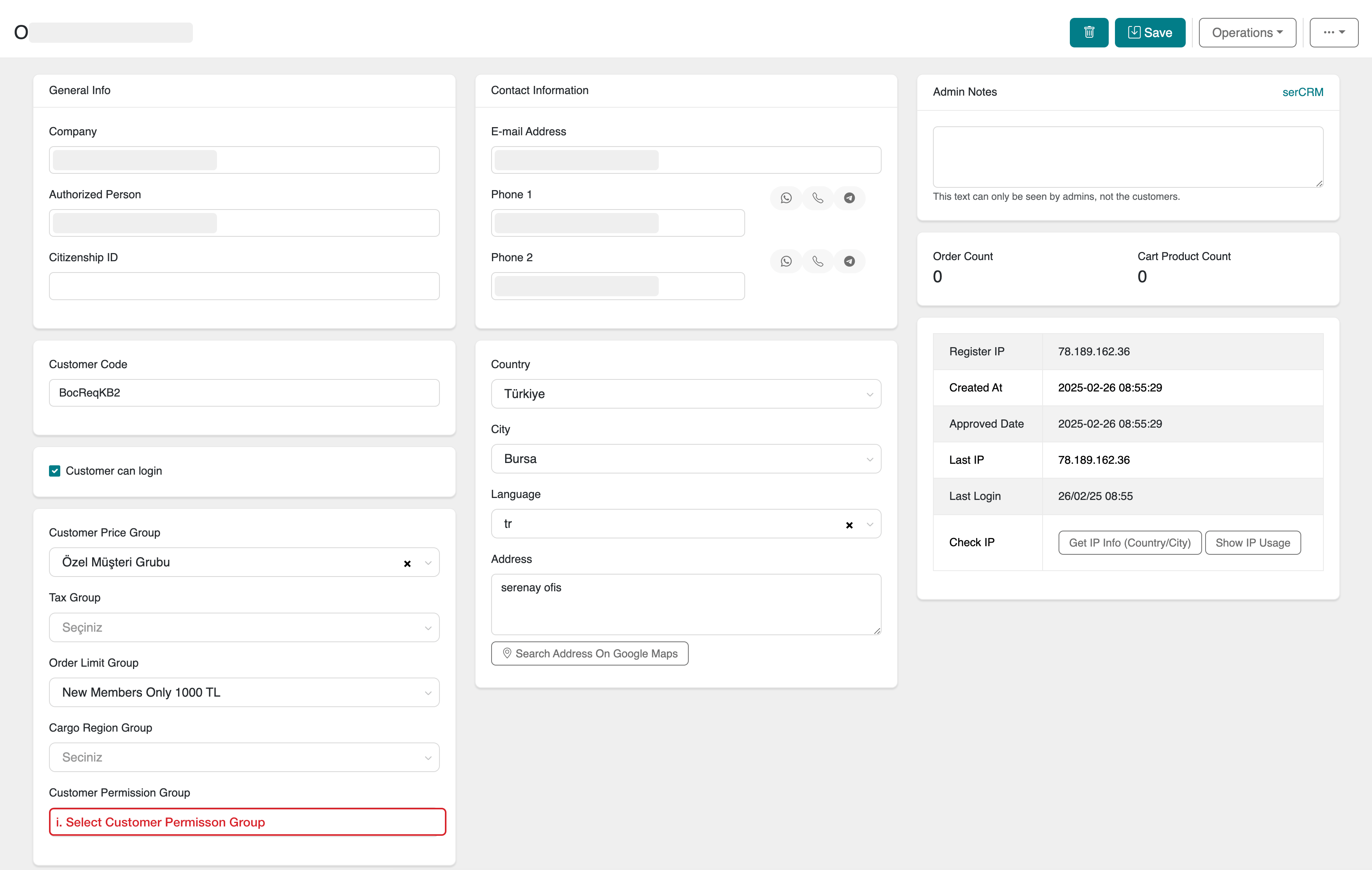 The Customer Permission Group module allows you to manage different user authorizations related to customers within the serB2B system. With this module, you can create new customer permission groups, edit existing groups, delete them, or view them. Each customer permission group can have specific authorization restrictions.