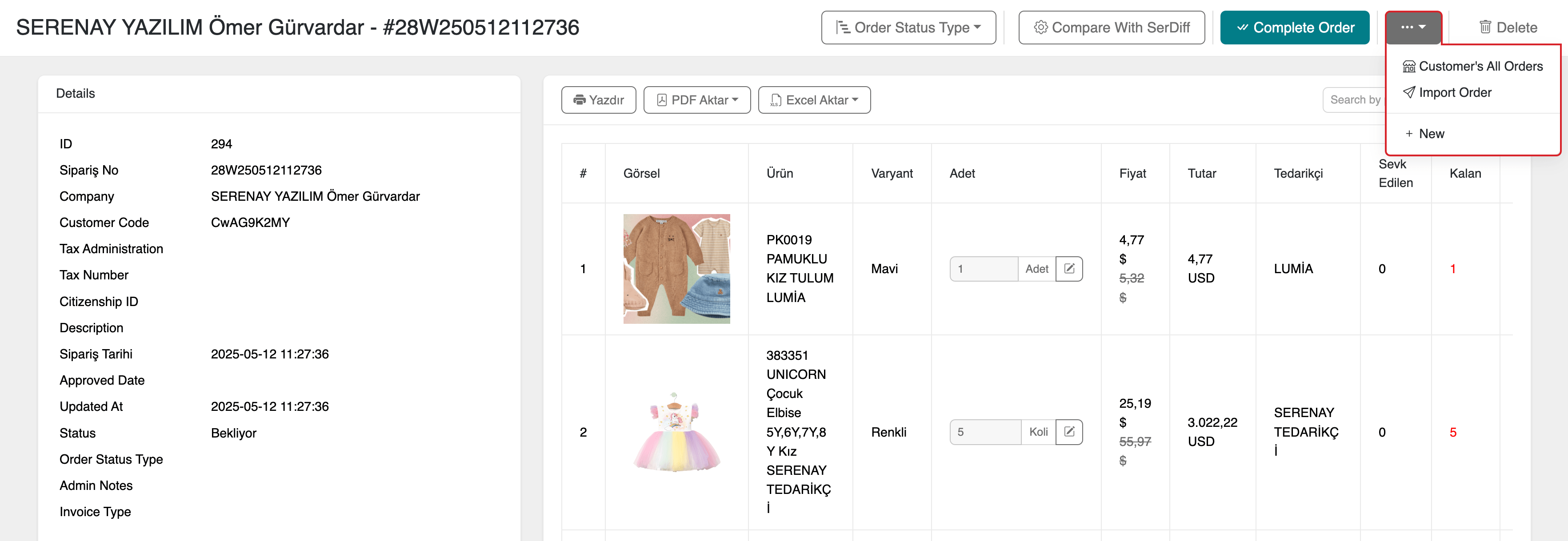 The Custom Menus feature allows serB2B users to speed up product, customer, and order management processes, perform instant analyses, or create custom triggers. For example, from a product detail page, you can search the product on Google to see how your customers view it in search engines, or you can integrate a customer’s order into your ERP or accounting software with a single click to simplify your workflows.
