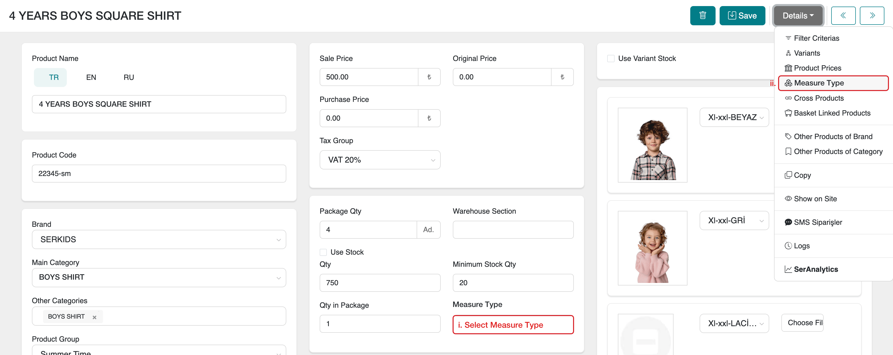 The Measurement Unit feature allows serB2B users to define, edit, and manage different measurement units for products. In addition to the main measurement unit, product-specific additional units and their multiplier values can be set. This enables easy tracking and sales operations in various formats such as pieces, boxes, or packages.