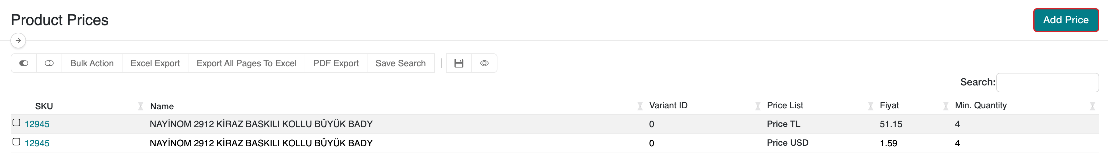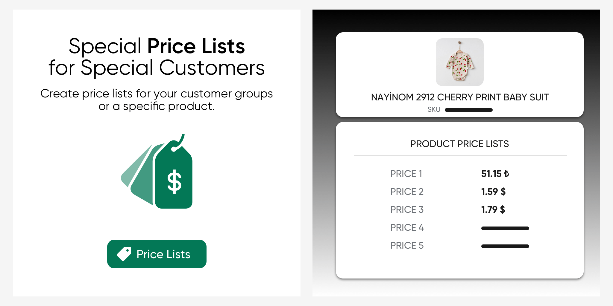 Price Lists are designed to generate customized pricing for specific products and customers. They are also used for inter-module communication in the serFoto, serMağaza, and serAPI modules.