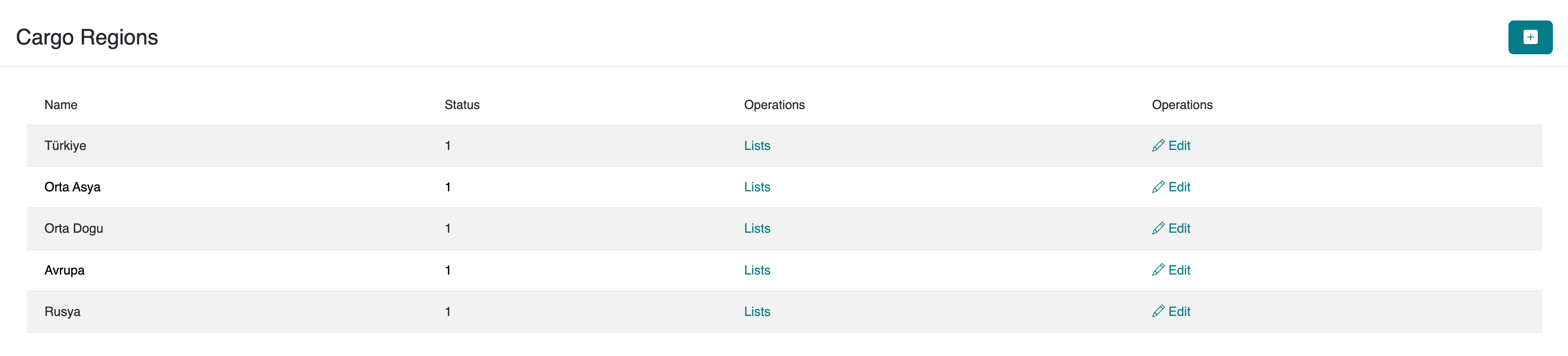 To create a new cargo region in your serB2B system, go to Settings > Cargo Regions in the admin panel and click the + icon located at the top right corner.
