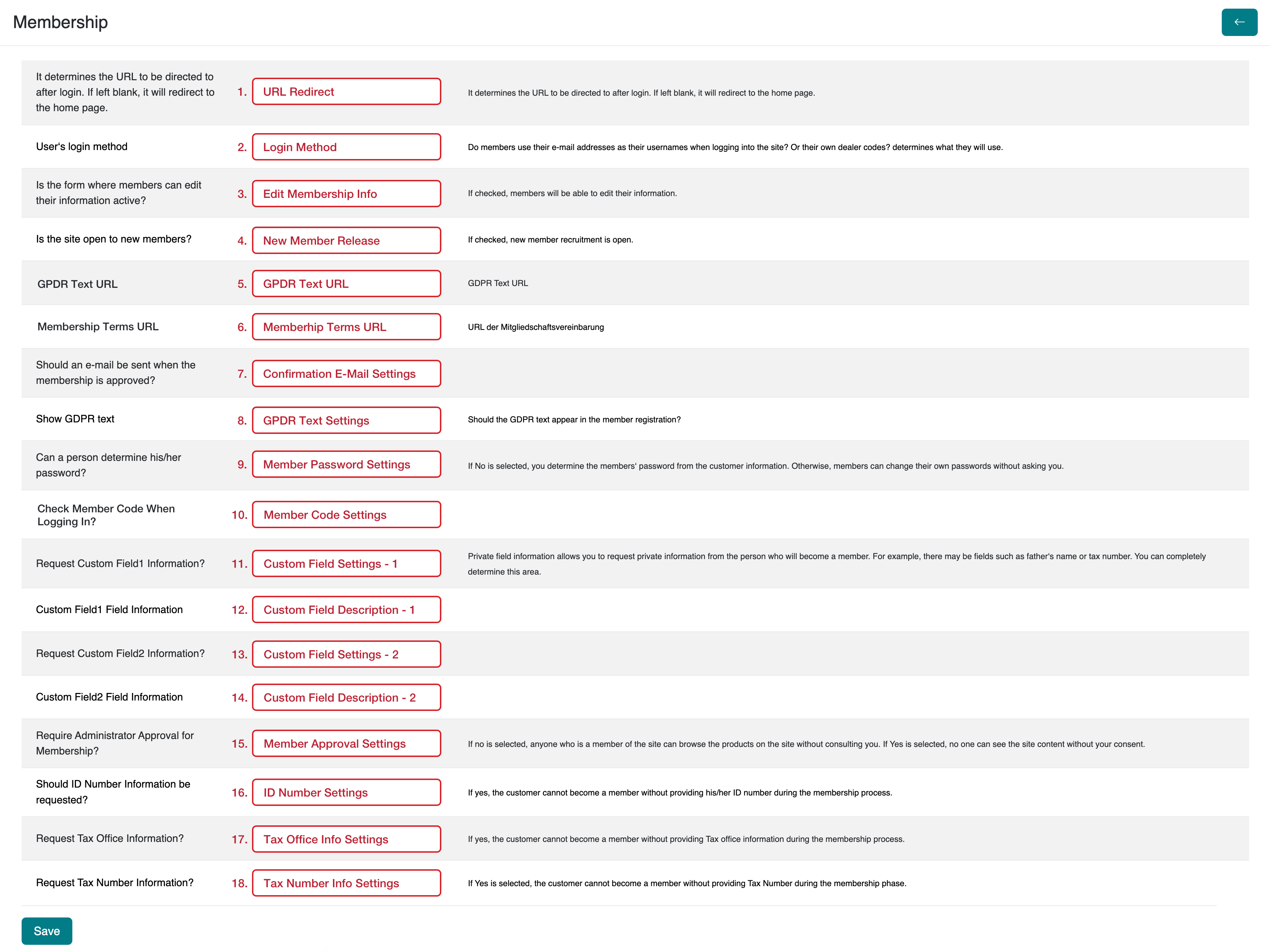 To configure membership-related settings, go to Settings > Membership in the serB2B admin panel.