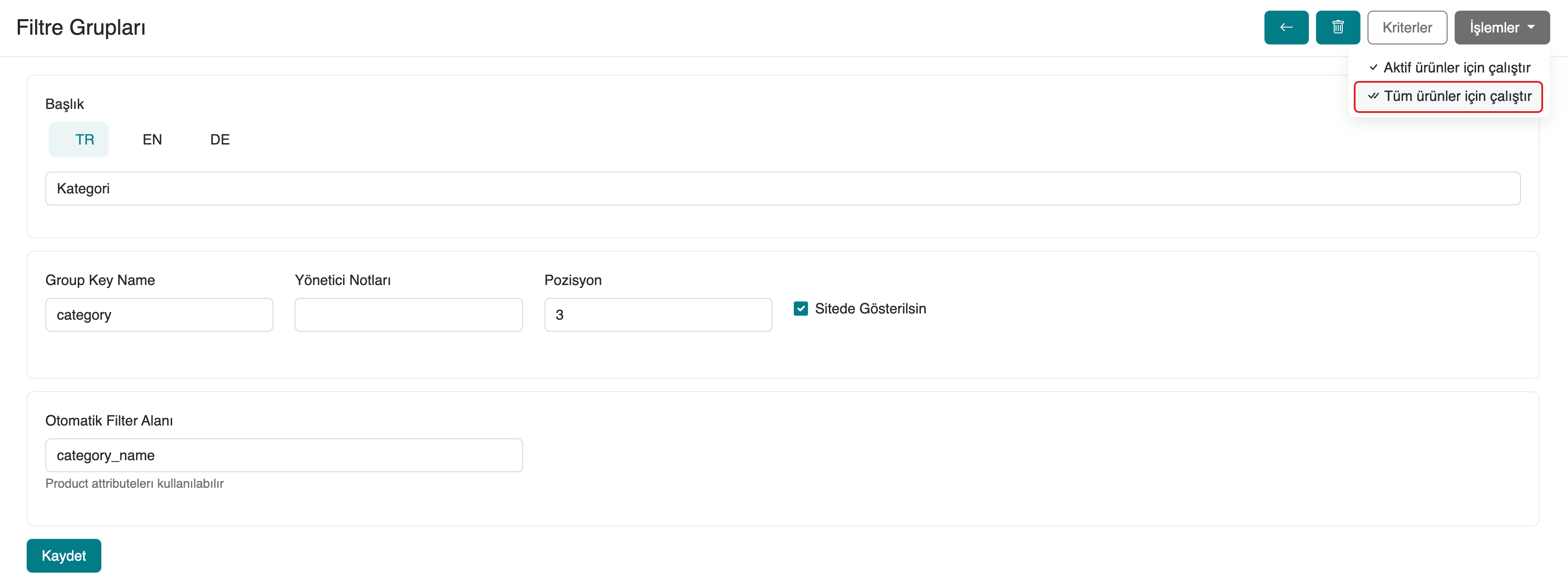 Filtre Grubunu Aktif/Tüm Ürünler İçin Çalıştırma