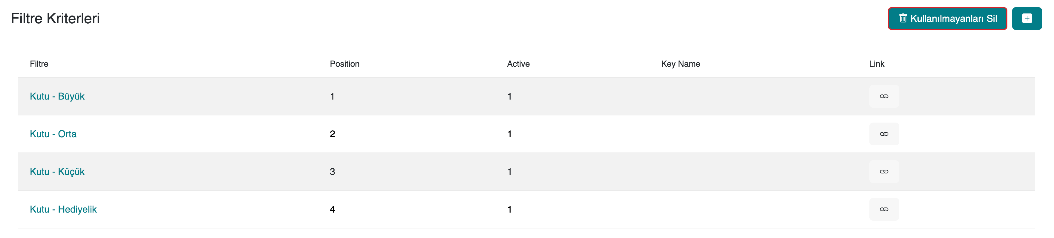 Yönetici panelinden Ürünler > Ürün Filtre Kriterleri bölümüne gidip, Kullanılmayanları Sil butonuna basarak bu kriterleri toplu halde silebilirsiniz.