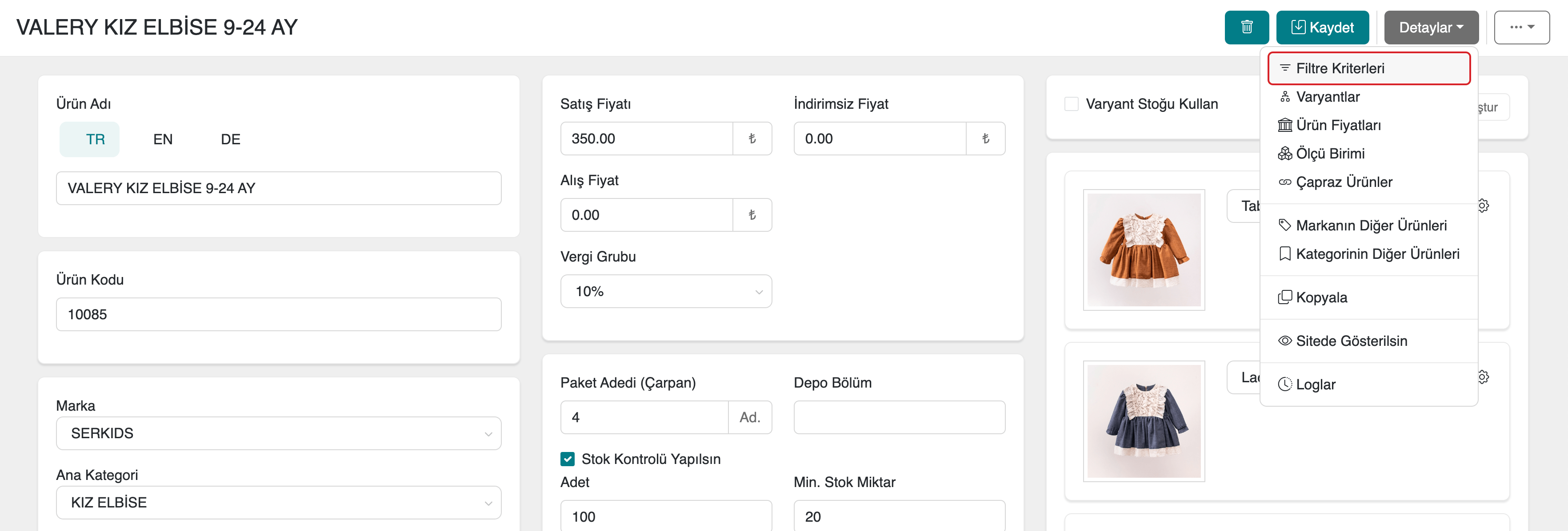 serB2B sisteminize yüklemiş olduğunuz bir ürüne özel olarak filtre ekleyebilirsiniz. Bu işlemi yapmadan önce filtre grubu ve filtre kriteri tanımlayın. Ardından serB2B sisteminizin yönetici paneli üzerinden ilgili ürünün detay sayfasına gidin ve sağ üst köşedeki Detaylar > Filtre Kriterleri bölümüne tıklayın.