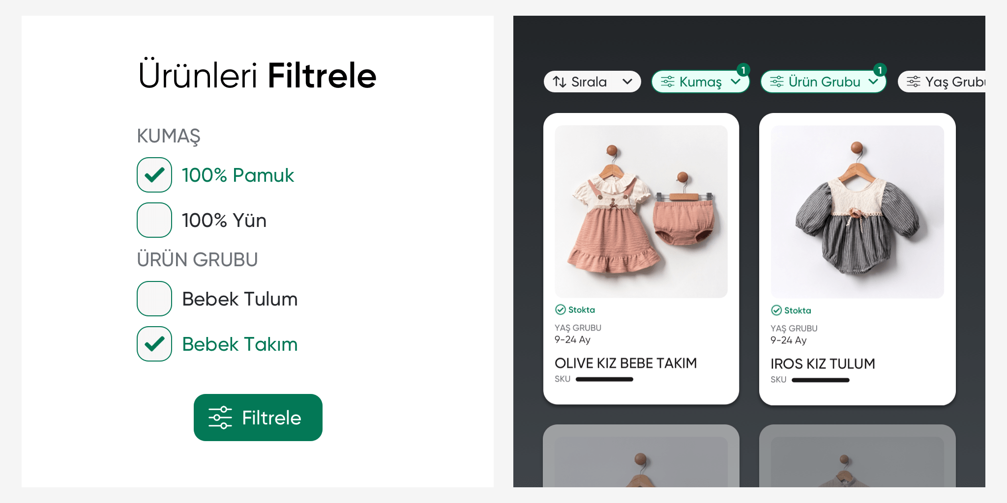 serB2B sisteminize tanımladığınız ürünler için filtre kriterleri oluşturabilir, kullanıcıların ürünleri doğru şekilde filtreleyerek aradıkları ürüne kolayca ulaşmalarını sağlayabilirsiniz.