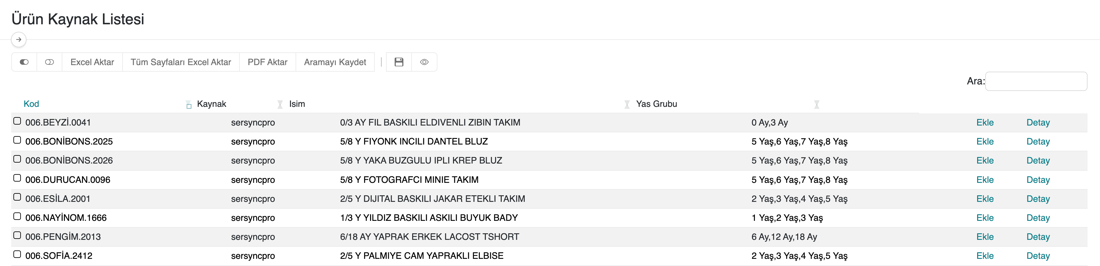 Ürün Kaynak Listesinde yer alan ürünler aşağıdaki örnekteki gibi görüntülenir.