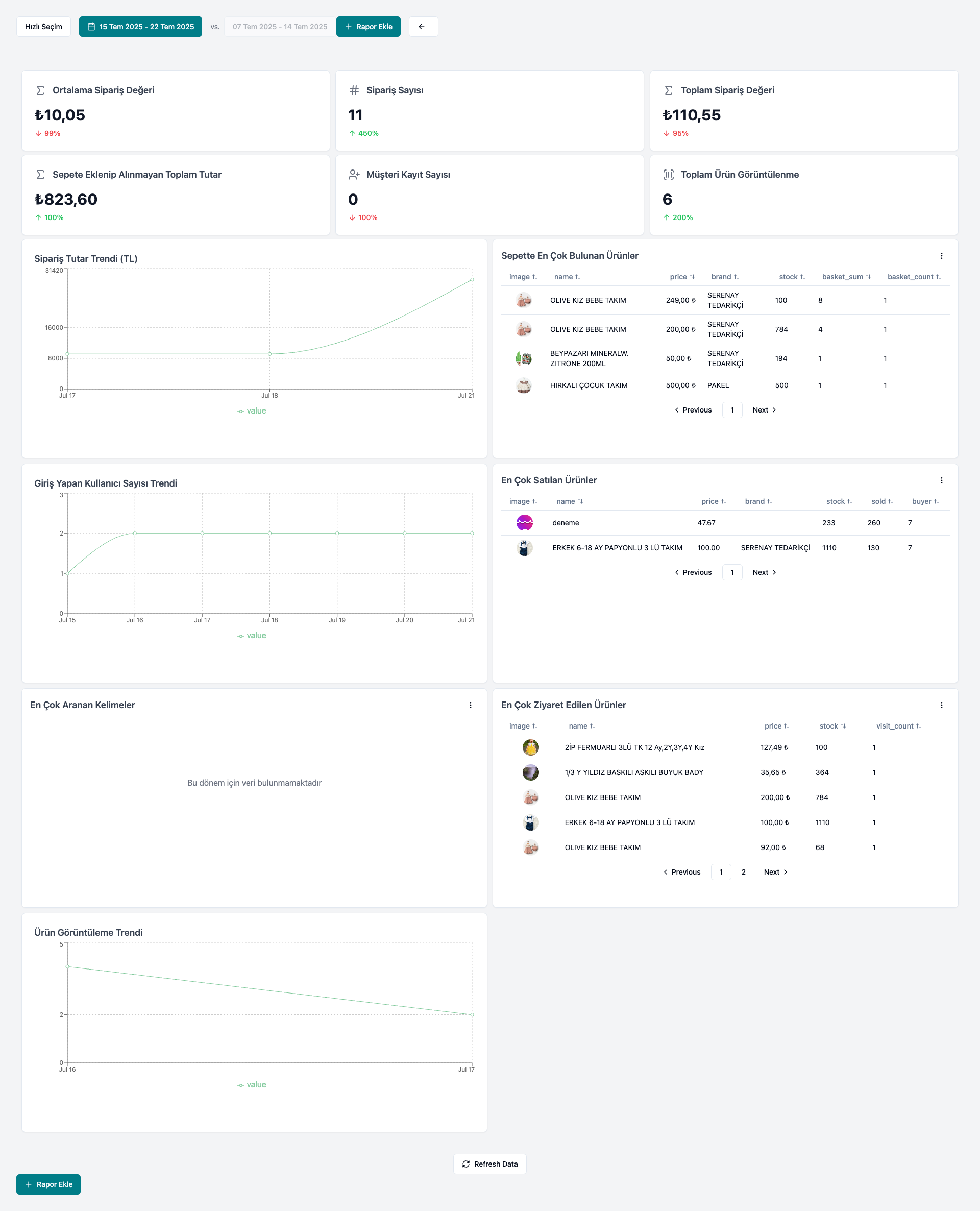 - Sepette Eklenip Alınmayan Toplam Tutar: Sepete eklenmiş ancak satın alınmamış ürünlerin toplam değeridir.