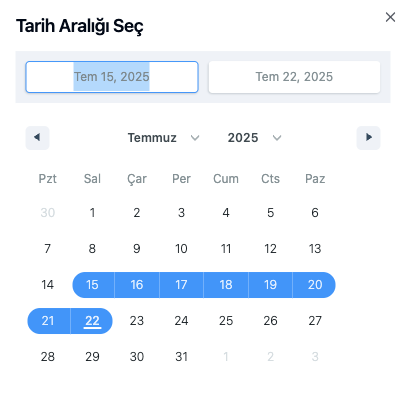 - Takvimden istediğiniz günleri işaretleyerek özel bir tarih aralığı belirleyebilirsiniz. Örneğin, 15 Temmuz 2025 ile 22 Temmuz 2025 arasını seçmek için ilgili günleri tıklamanız yeterlidir. Bu sayede bu tarihler arasındaki analizleri yapıp firmanızın faydasına olabilecek bir rapor oluşturabilirsiniz.