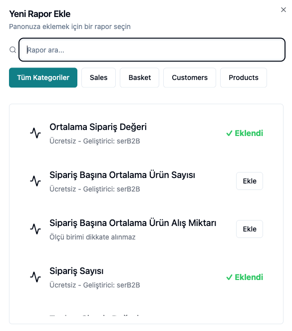 - Eklemek istediğiniz raporun yanındaki "Ekle" düğmesine tıklayın. Eğer rapor zaten ekliyse, "Eklendi" yazısını göreceksiniz.