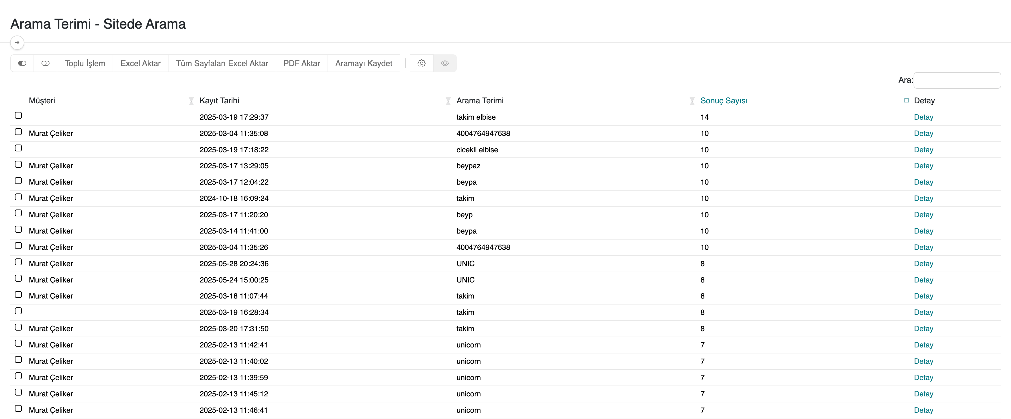 Arama Terimi - Sitede Arama modülü, serB2B sisteminde kullanıcılar tarafından yapılan aramaların kayıt altına alındığı ve raporlandığı bölümdür. Bu modül sayesinde hangi arama terimlerinin ne zaman ve kaç kez arandığını detaylı şekilde görüntüleyebilirsiniz.