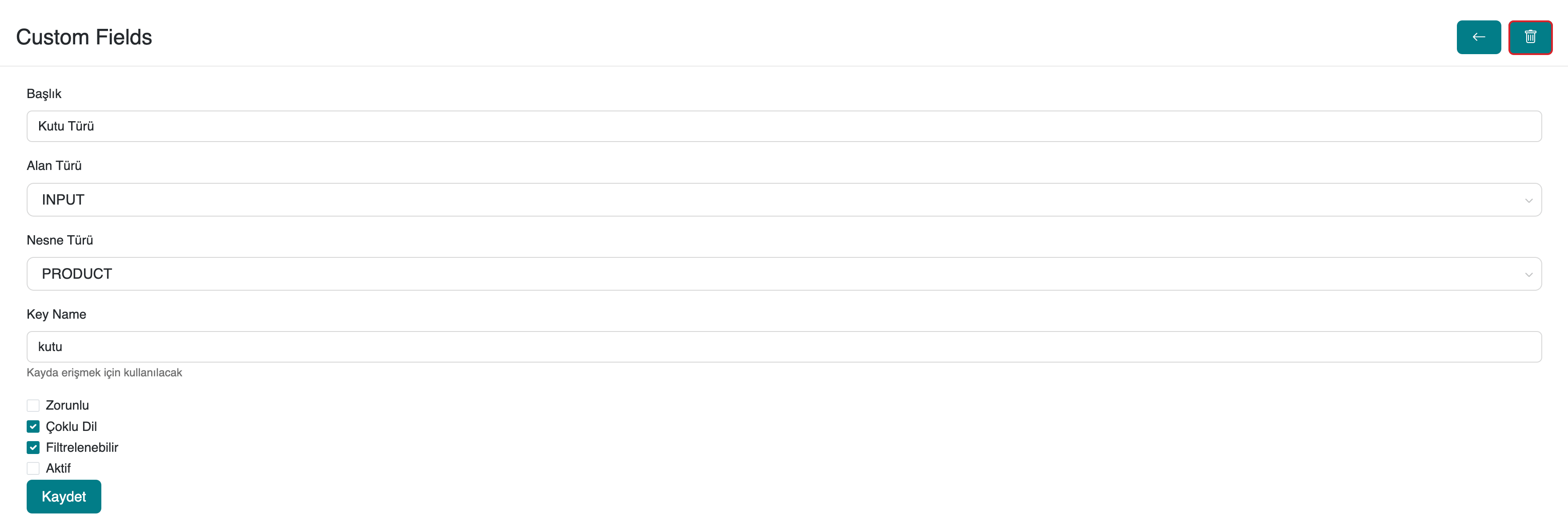 serB2B sisteminizde mevcut olan veya yeni oluşturduğunuz custom fields - özel alanları görüntülemek ve silmek için yönetici panelinden Ayarlar > Custom Fields (Özel Alanlar) bölümüne gidin. Silmek istediğiniz custom fields - özel alan satırındaki Düzenle butonuna tıklayın. Ardından sayfanın sağ üst kısmında bulunan iconuna tıklayın ve silmek için onaylayın.