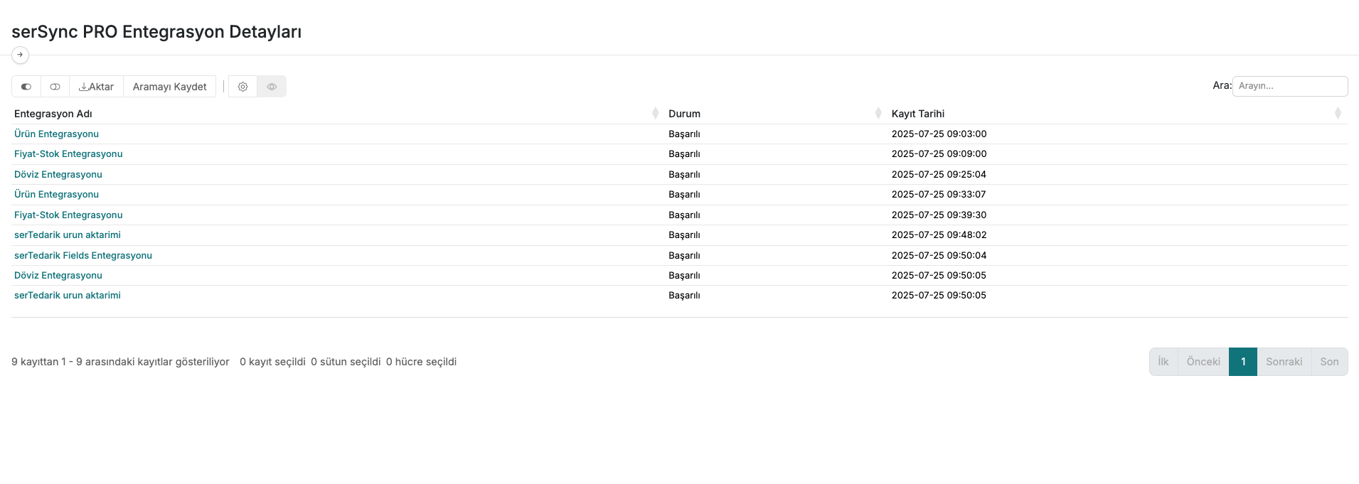 Her entegrasyon çalıştığında, bu ekran otomatik olarak bir log kaydı oluşturur. Bu loglar sayesinde: