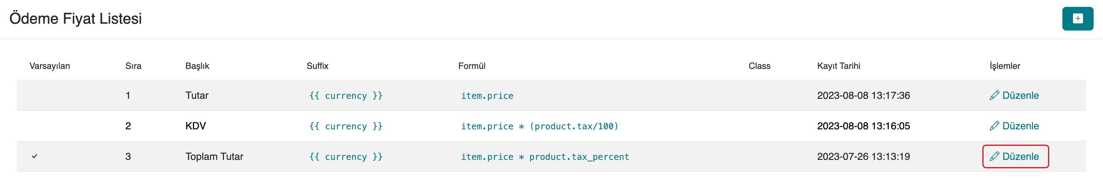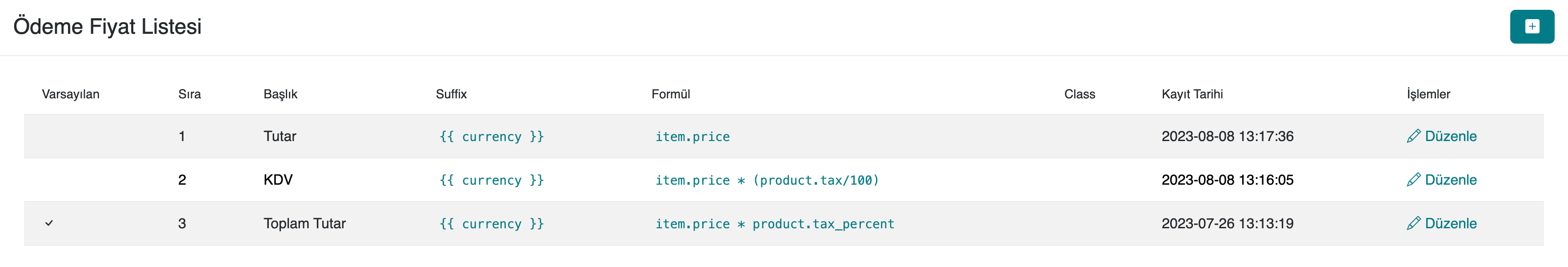 Yeni bir ödeme fiyat listesi oluşturmak için Ayarlar > Ödeme Tutar Ayarları bölümünde sağ üst köşede bulunan + ikonuna tıklayın. Sonrasında başlık, sıra numarası, formül, stil sınıfı ve ek açıklama gibi alanları doldurarak listeyi kaydedebilirsiniz.