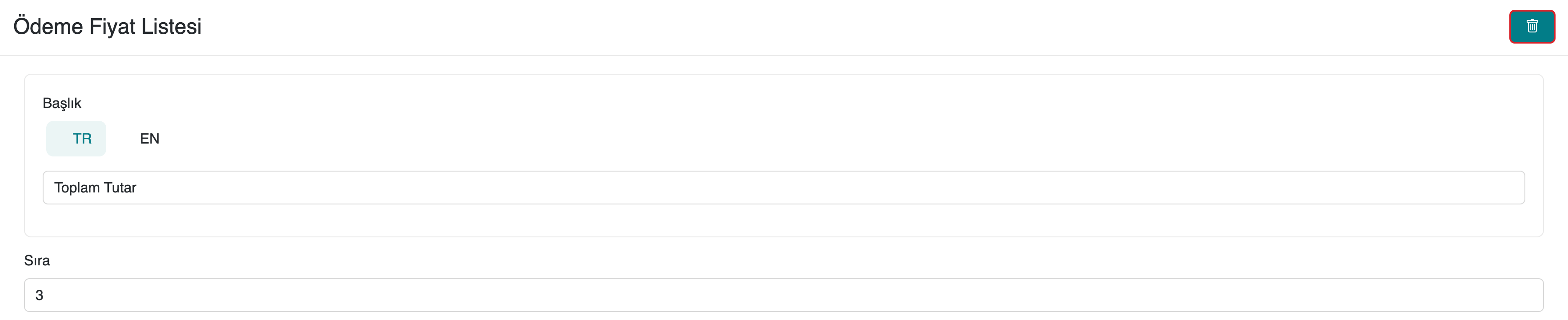 serB2B sisteminizde mevcut olan veya yeni oluşturduğunuz ödeme fiyat listelerini görüntülemek ve silmek için yönetici panelinden Ayarlar > Ödeme Tutar Ayarları bölümüne gidin. Silmek istediğiniz ödeme fiyat satırındaki Düzenle butonuna tıklayın. Ardından sayfanın sağ üst kısmında bulunan iconuna tıklayın ve silmek için onaylayın.