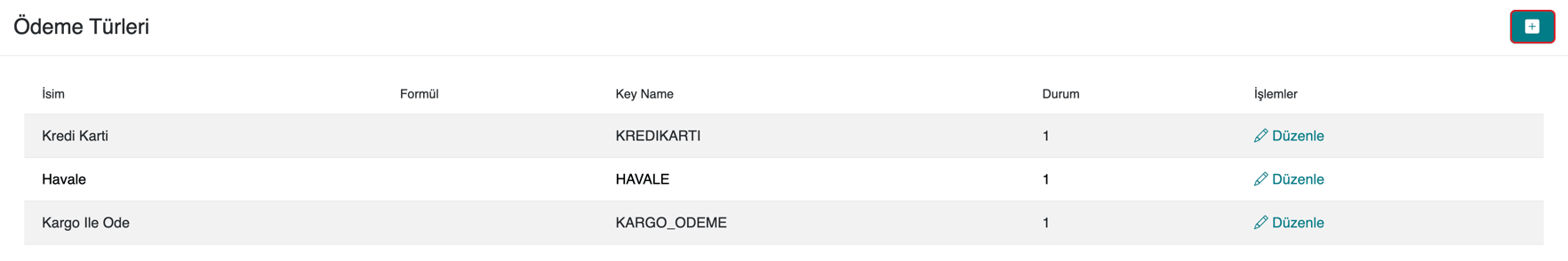 serB2B sisteminizin yönetici panelinden Ayarlar > Ödeme Türleri bölümüne gidin ve tanımlı ödeme türlerini listeleyin.