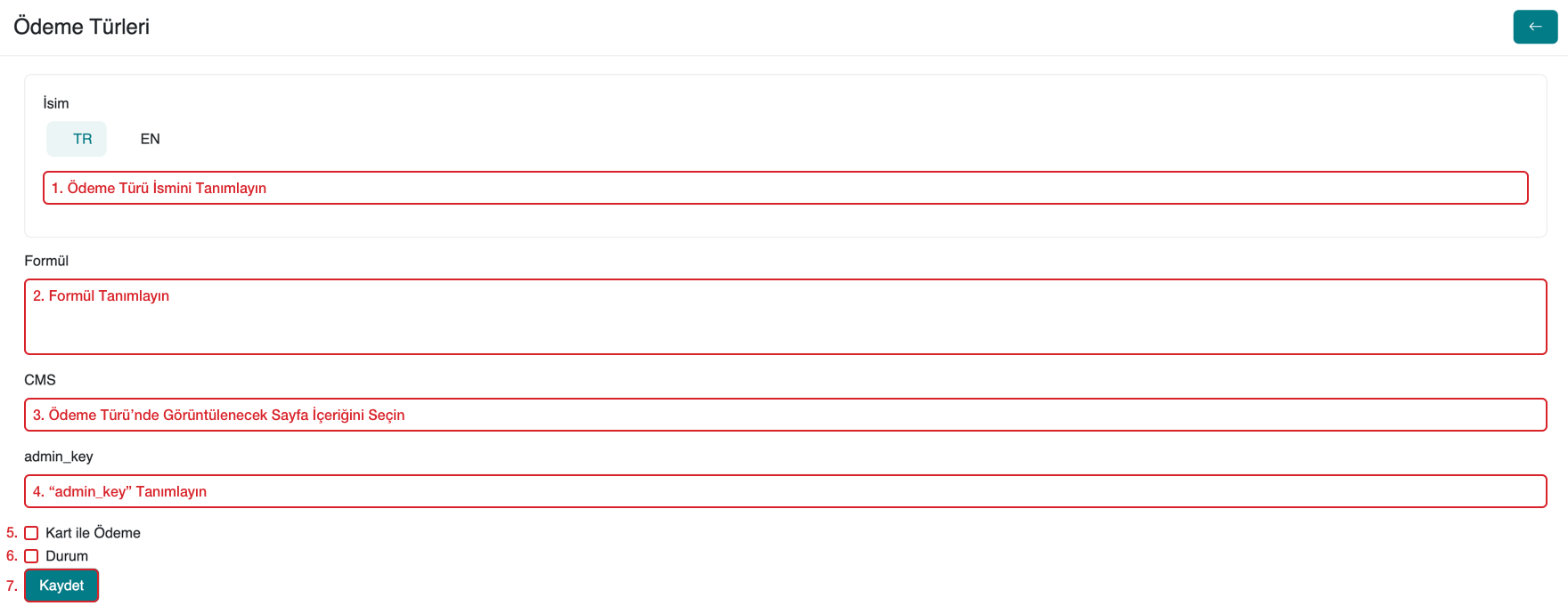 - Ödeme Türü İsmini Girin: Oluşturmak istediğiniz ödeme türü ismini tanımlayın.