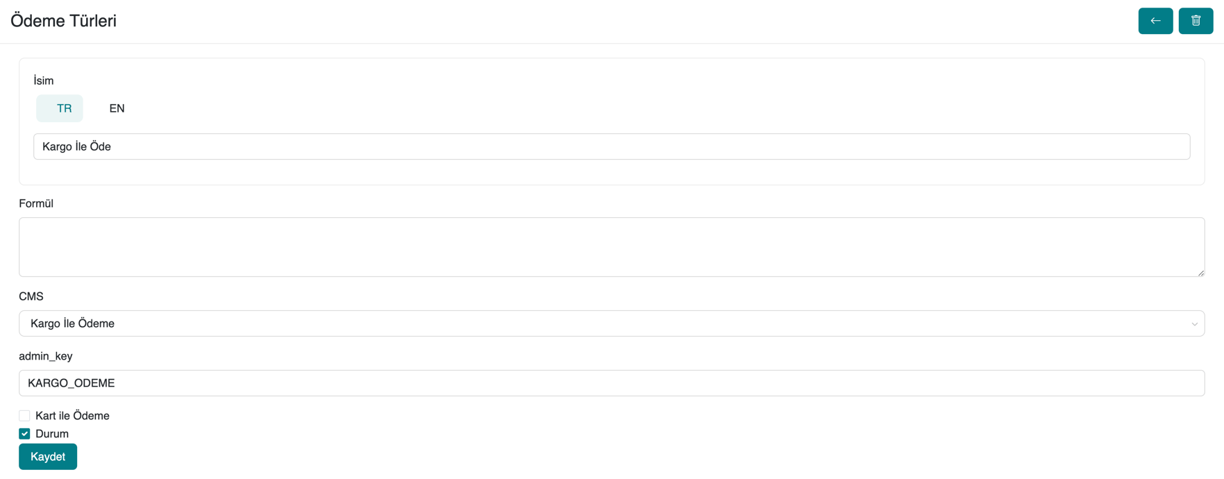 Örnek: Kargo ile Ödeme seçeneğini eklemek için forma aşağıdaki bilgileri girelim.