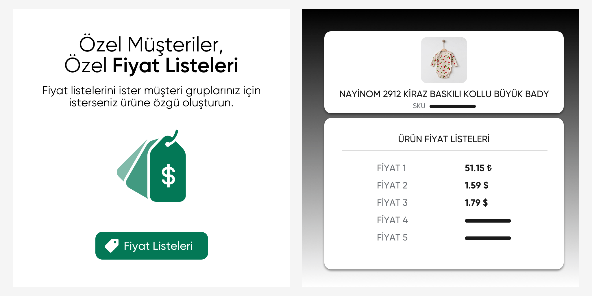 serB2B sisteminde ürünlerinize ve müşterilerinize özel, farklı para birimlerinde fiyatlar tanımlayarak kişiye özel fiyatlandırmalar yapabilirsiniz. Ürünlerinize tanımladığınız fiyatları baz alarak tek bir işlemle yeni fiyat listeleri türetebilir ve tüm ürünleriniz için güncel fiyat listeleri oluşturabilirsiniz.