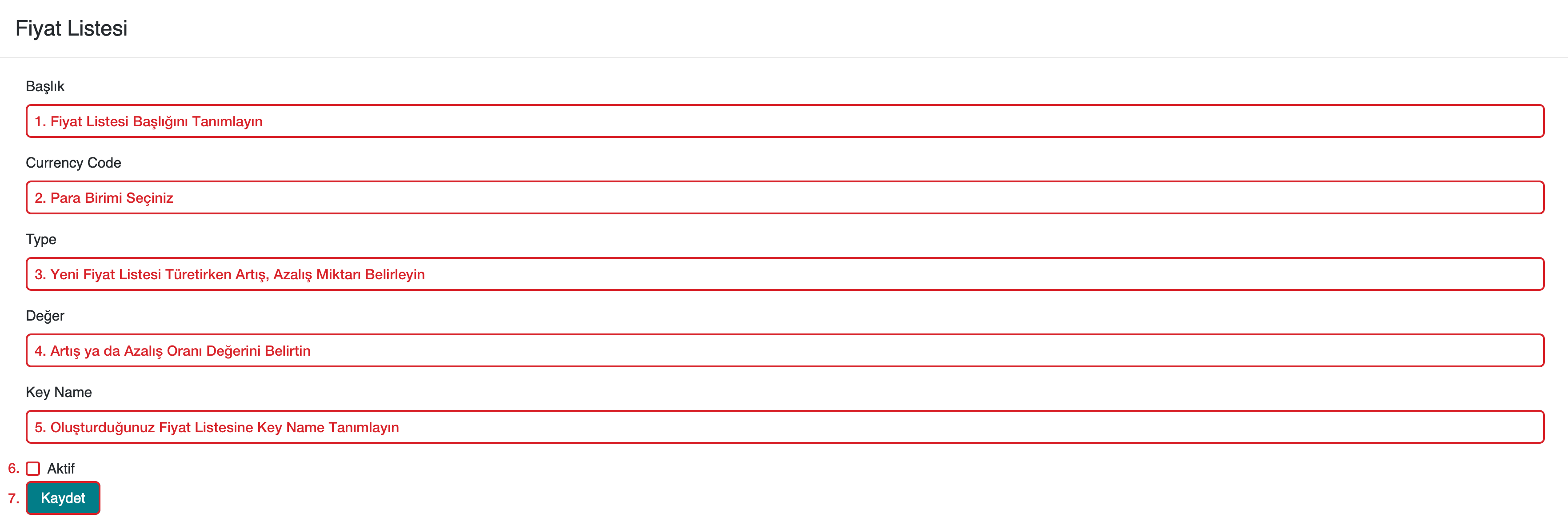 - Başlık: Fiyat listesi başlığına tanımlayın.