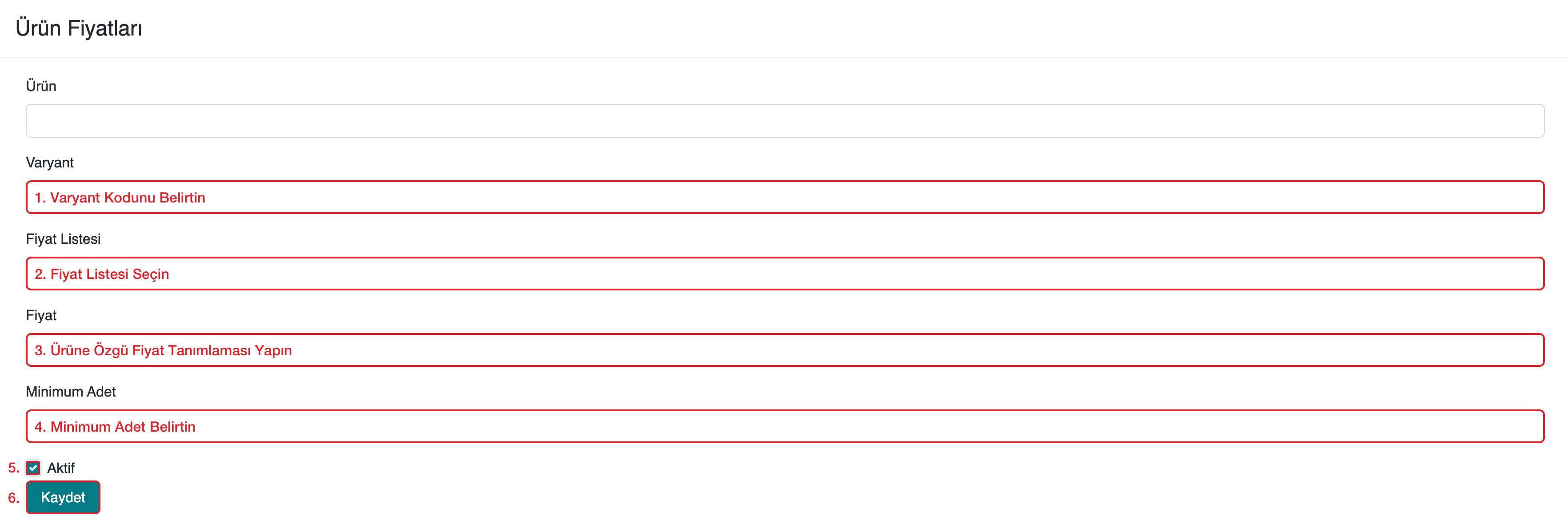 - Fiyat: Bu ürüne / varyanta özgü fiyat yazın.