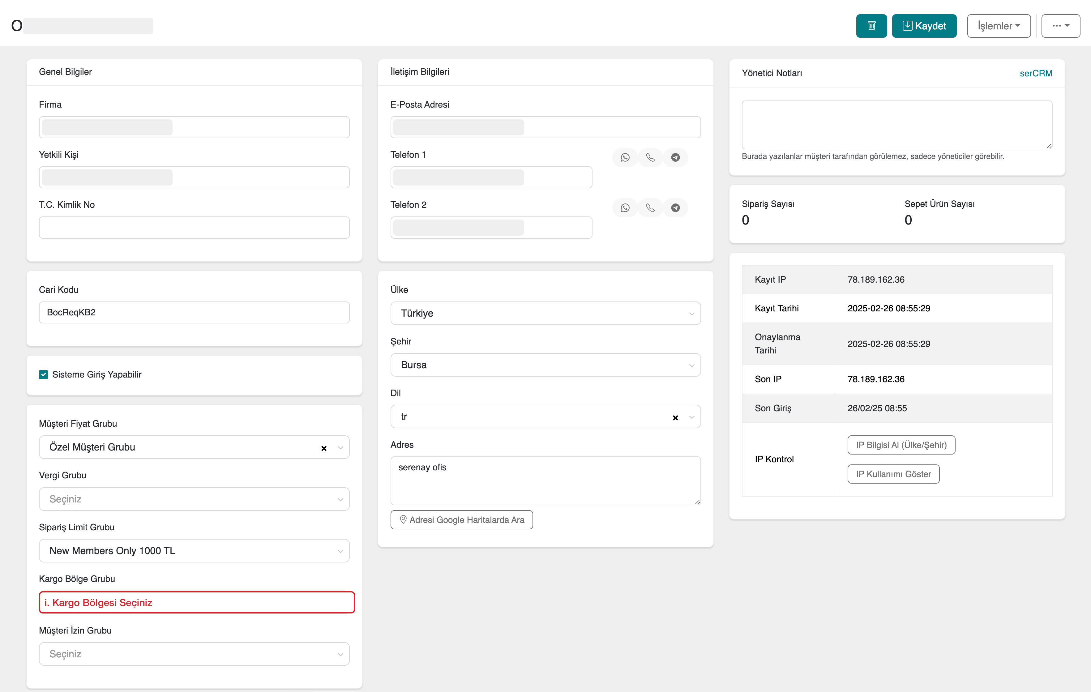 1. Müşteri kaydında kargo bölgesi seçilmezse ne olur?