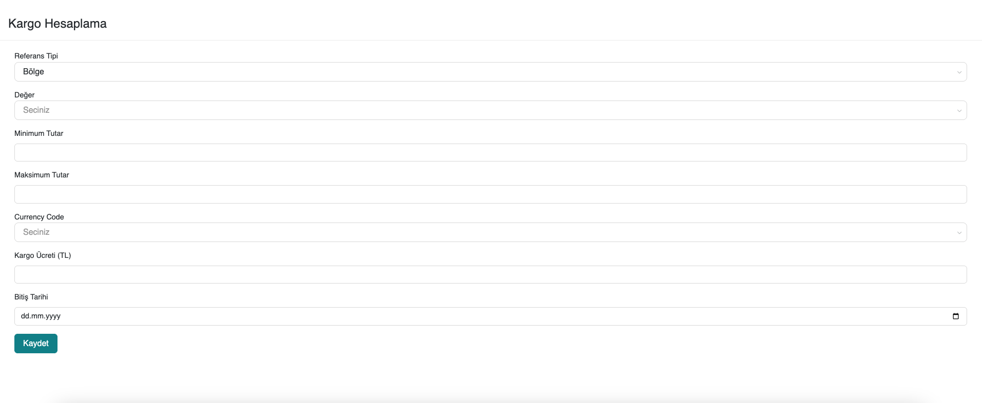 - Referans Tipi Seçin: Kargo hesaplamasının uygulanacağı referans tipini (örn: Ülke ya da Bölge) seçin.