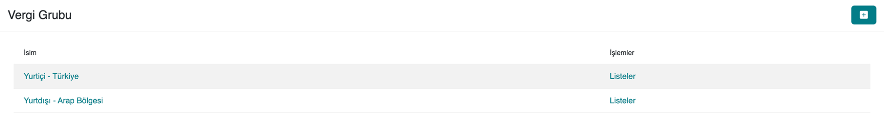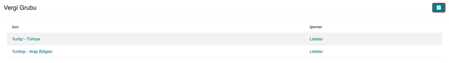 serB2B sisteminizde yeni vergi listesi oluşturmak için yönetici panelinden Ayarlar > Vergi Grubu bölümüne gidin ve ardından sağ üst köşede bulunan + iconuna tıklayın.
