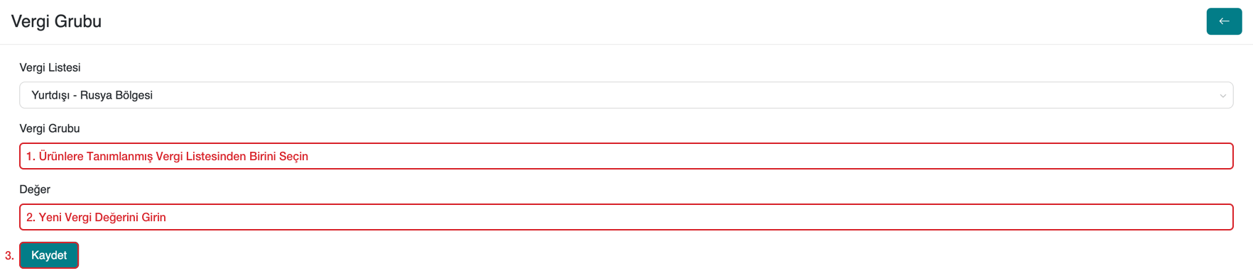 - Vergi Grubu İsmi Tanımlayın: Vergi Grubu için isim tanımlayın. (ör. "Yurtdışı - Rusya Bölgesi").