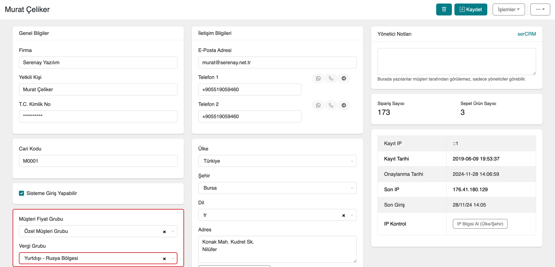 Vergi grubu değiştikten sonra müşteri detay sayfası şu şekilde güncellenir: