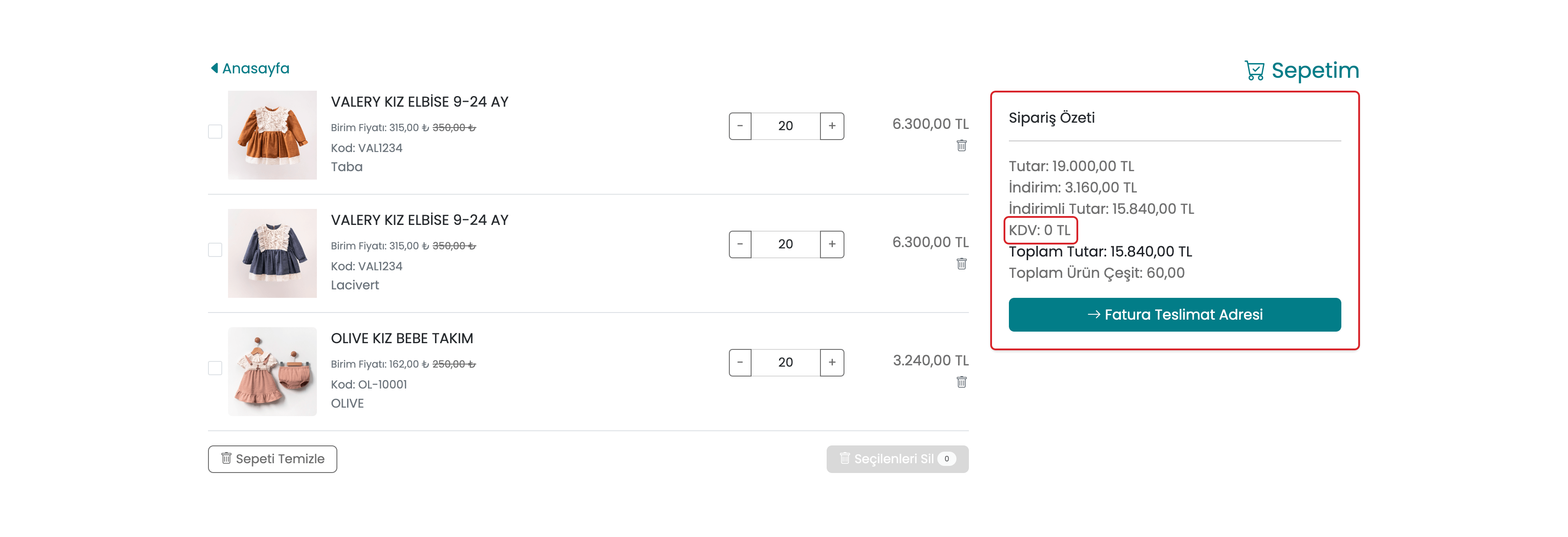 Yeni vergi değeri, müşteri sepetteki ürünlerinde sıfırlanmış olarak görünür.