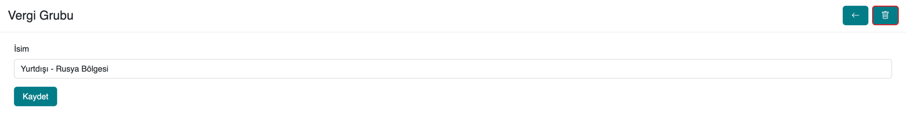 serB2B sisteminizde mevcut olan veya yeni oluşturduğunuz vergi gruplarını görüntülemek ve silmek için yönetici panelinden Ayarlar > Vergi Grubu bölümüne gidin. Silmek istediğiniz vergi grubu satırındaki Düzenle butonuna tıklayın. Ardından sayfanın sağ üst kısmında bulunan iconuna tıklayın ve silmek için onaylayın.