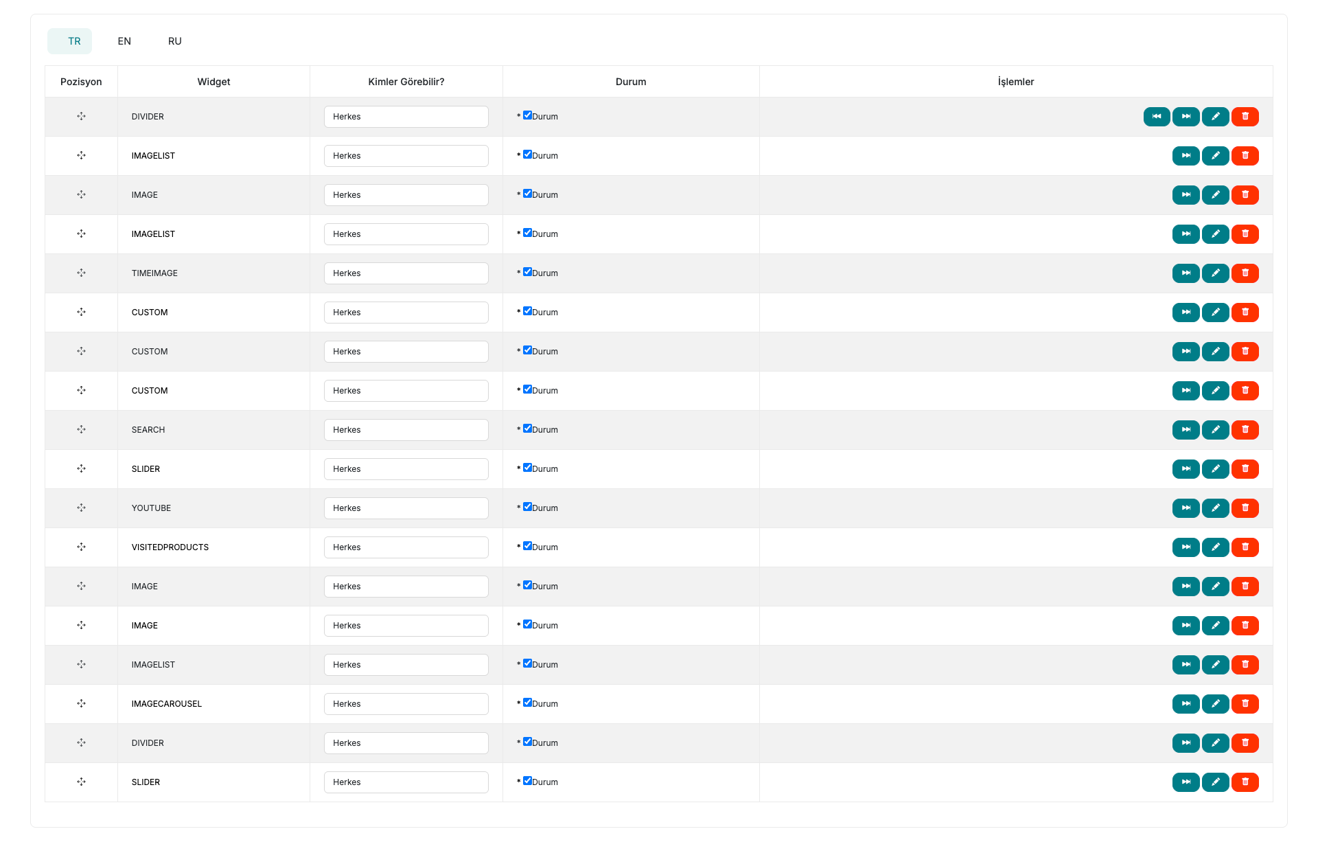 Mobil uygulamanızda farklı dillerde tasarım yapabilmek için öncelikle serB2B sisteminizde tanımlı dil seçeneklerinden birini seçin (Örnek:TR, EN, RU, FR, AR) ve ardından ilgili dile özgü widget türlerini ekleyin. Tasarımınızı serMobile PRO | Ana Sayfa Tasarımı dokümanındaki adımları izleyerek tamamlayın.