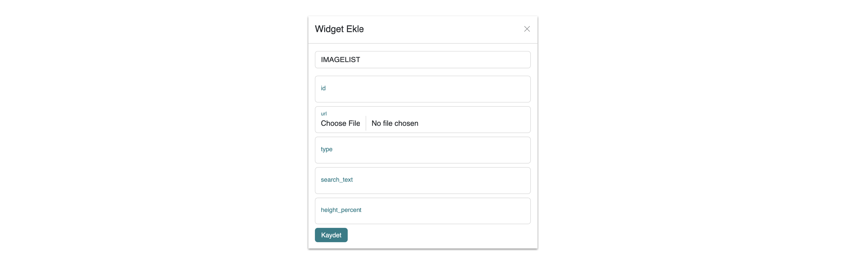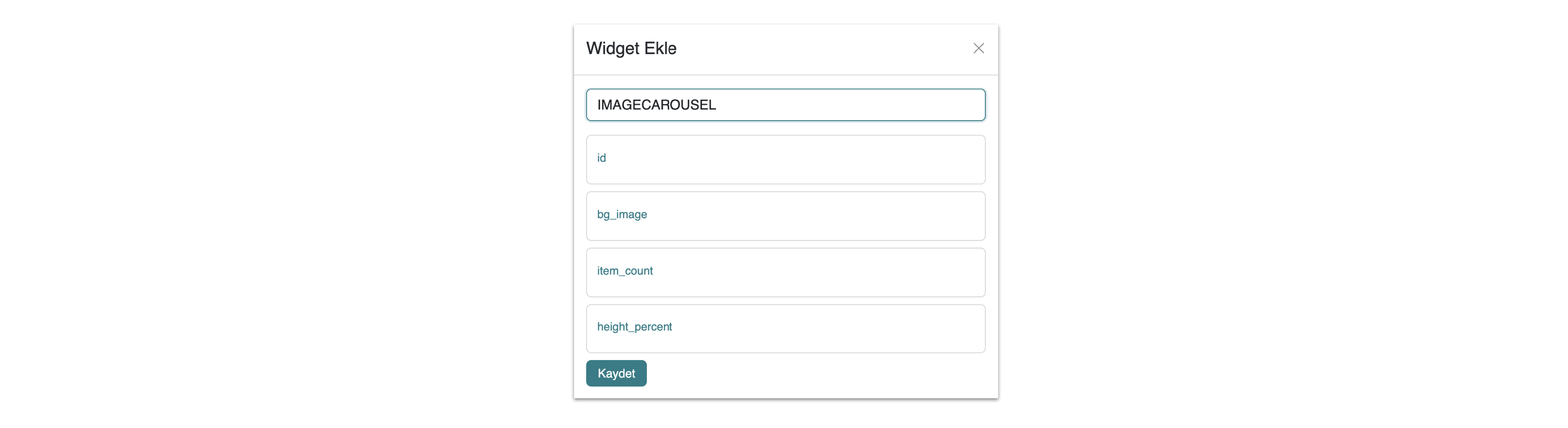 Bu widget ile dilediğiniz resimleri öncelikle Admin paneli üzerinden Tasarım > Slaytlar bölümüne ekleyin. Oluşturmuş olduğunuz Slayt'ın ID değerini IMAGECAROUSEL widget eklerken id alanına girin.