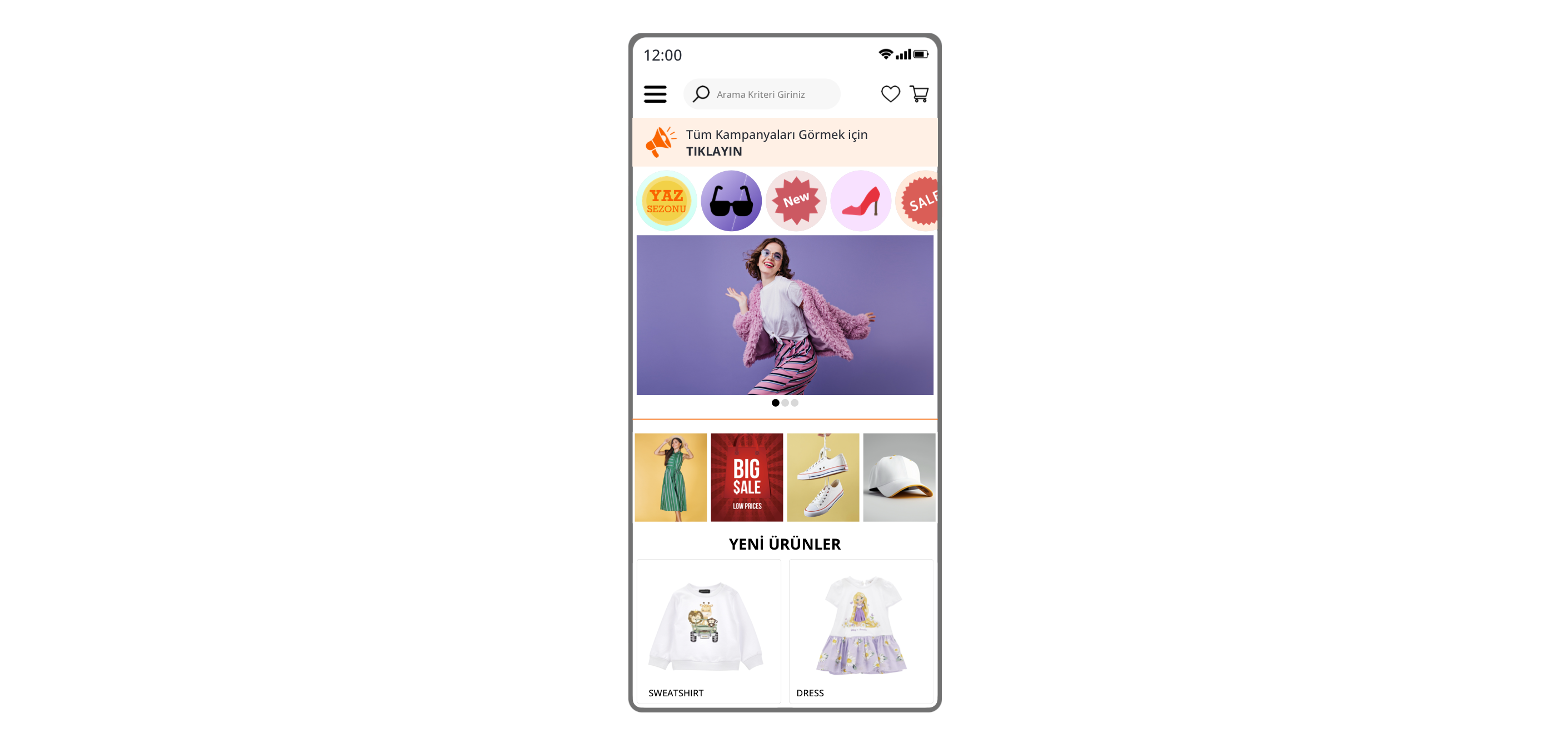 Mobil uygulamanızın ana sayfa tasarımını, uygulamanıza serB2B sisteminize tanımlı dil seçeneklerine göre özelleştirebilir ve App Store, Google Play Store ve Huawei App Gallery* uygulama mağazalarında ek bir güncelleme onayı olmadan anında yayınlayabilirsiniz.